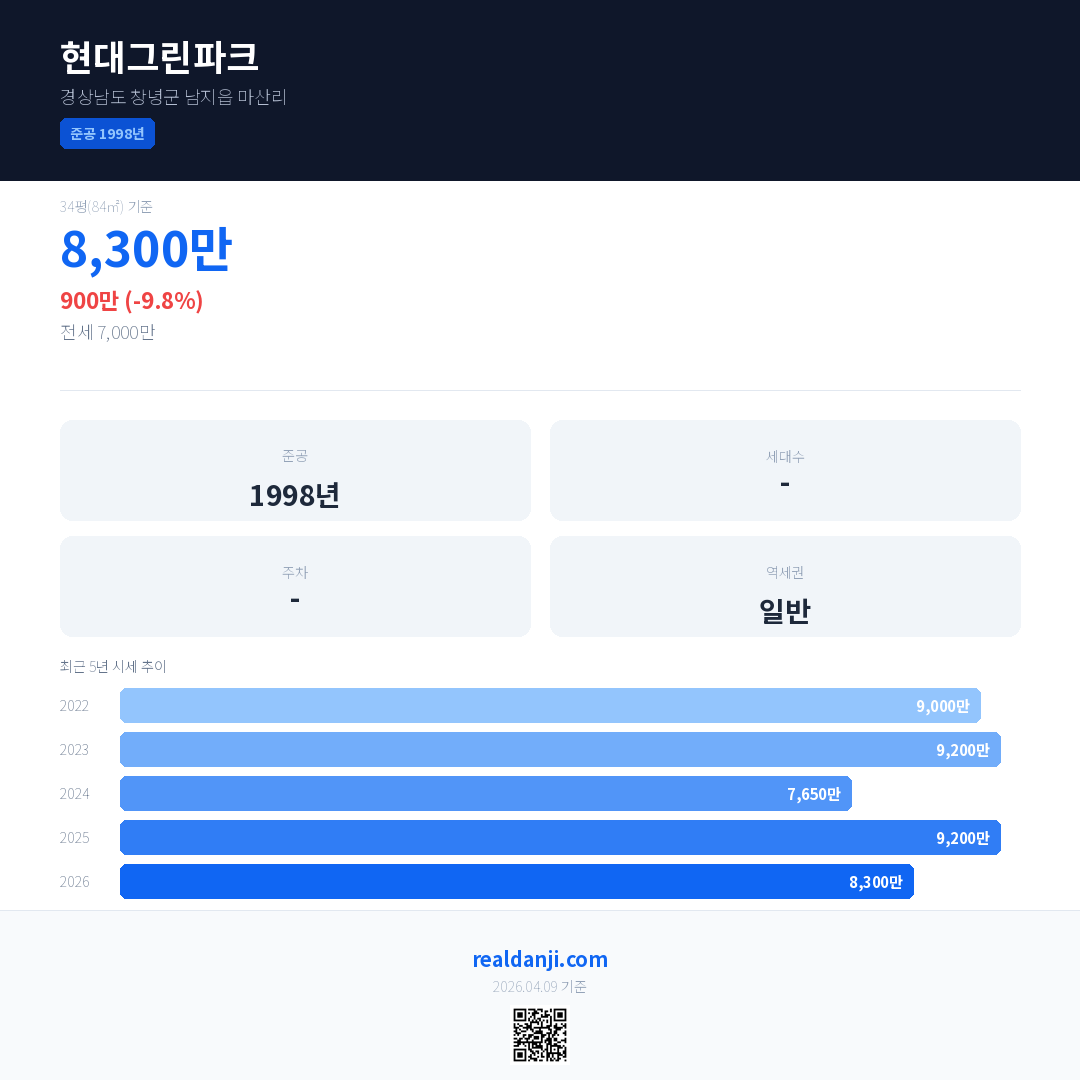 현대그린파크 국민평형 기준 2026년 평균 거래가는 8,300만으로, 전년 대비 9.8% 하락 했습니다.