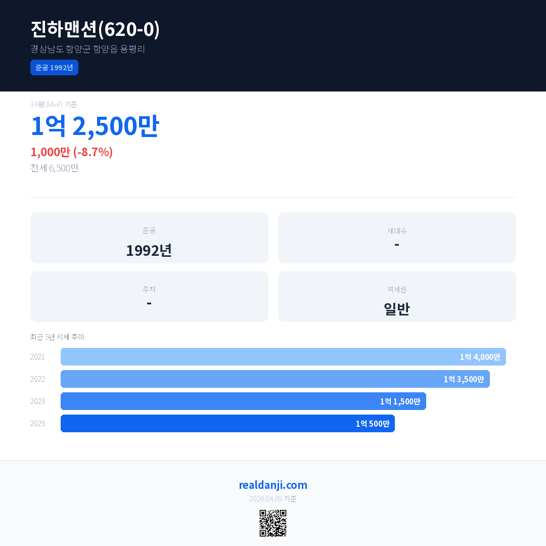 진하맨션(620-0) 국민평형 기준 2025년 평균 거래가는 1억 500만으로, 전년 대비 8.7% 하락 했습니다.
