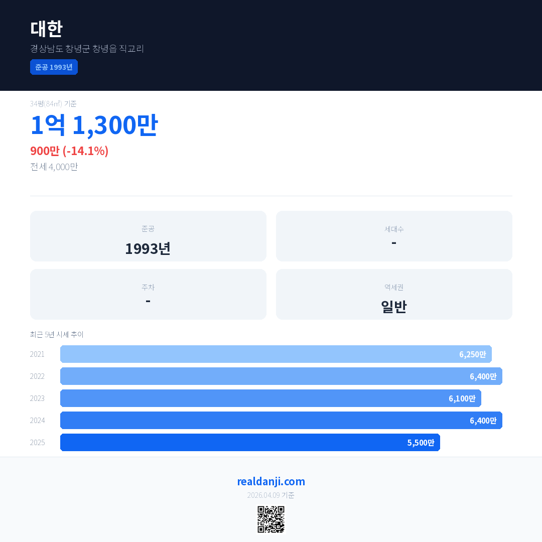 대한 국민평형 기준 2025년 평균 거래가는 5,500만으로, 전년 대비 14.1% 하락 했습니다.