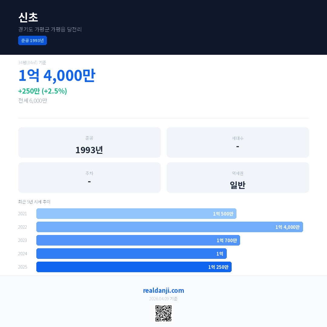 신초 국민평형 기준 2025년 평균 거래가는 1억 250만으로, 전년 대비 2.5% 상승 했습니다.