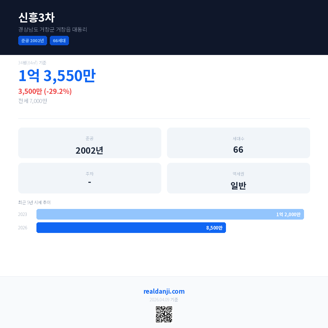 신흥3차 국민평형 기준 2026년 평균 거래가는 8,500만으로, 전년 대비 29.2% 하락 했습니다.