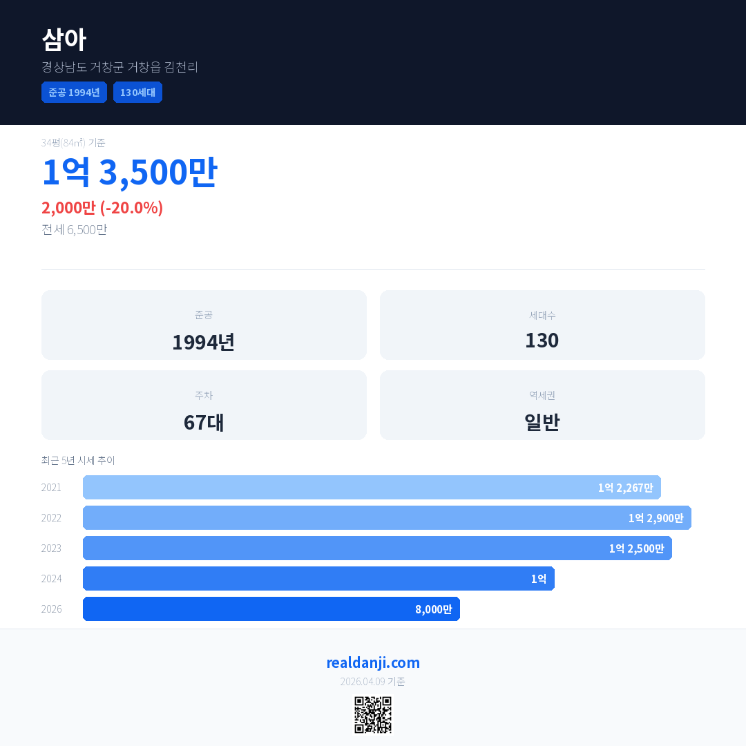 삼아 국민평형 기준 2026년 평균 거래가는 8,000만으로, 전년 대비 20.0% 하락 했습니다.