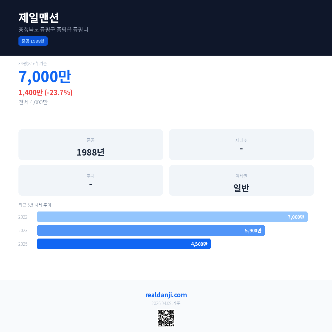 제일맨션 국민평형 기준 2025년 평균 거래가는 4,500만으로, 전년 대비 23.7% 하락 했습니다.