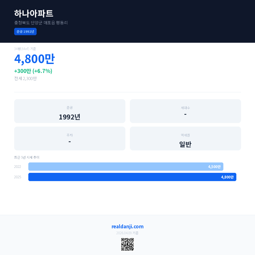 하나아파트 국민평형 기준 2025년 평균 거래가는 4,800만으로, 전년 대비 6.7% 상승 했습니다.