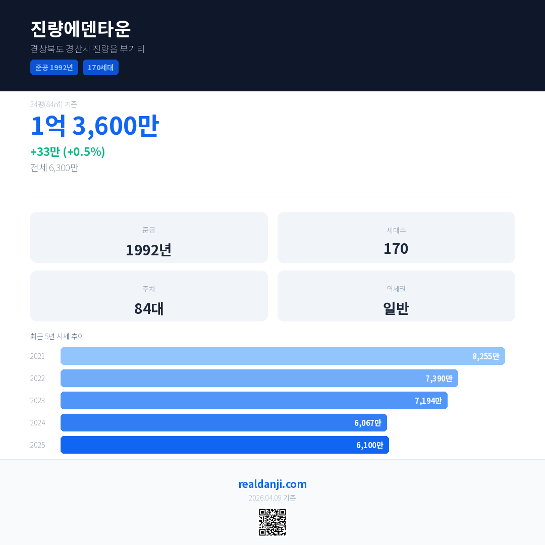 진량에덴타운 국민평형 기준 2025년 평균 거래가는 6,100만으로, 전년 대비 0.5% 상승 했습니다.
