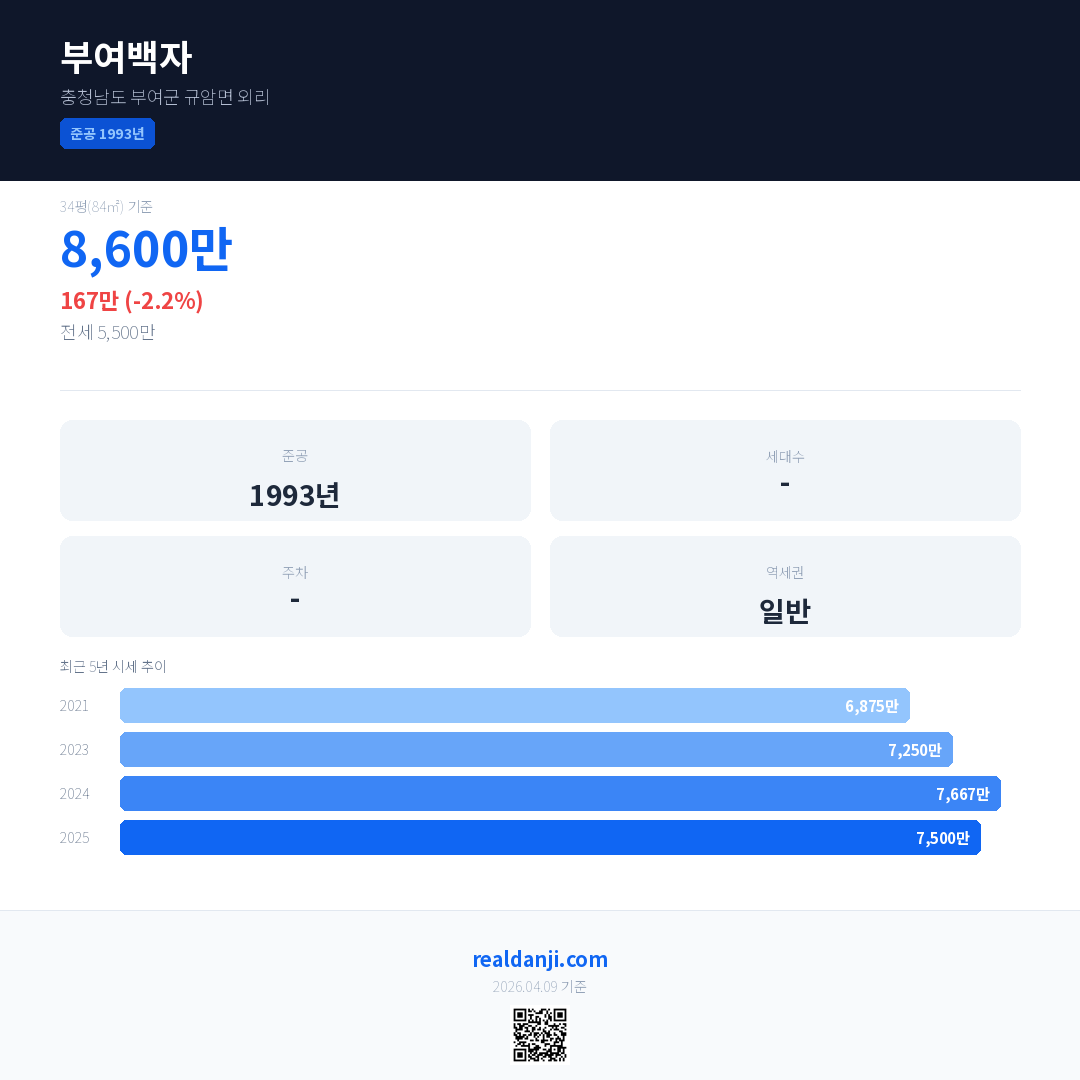 부여백자 국민평형 기준 2025년 평균 거래가는 7,500만으로, 전년 대비 2.2% 하락 했습니다.