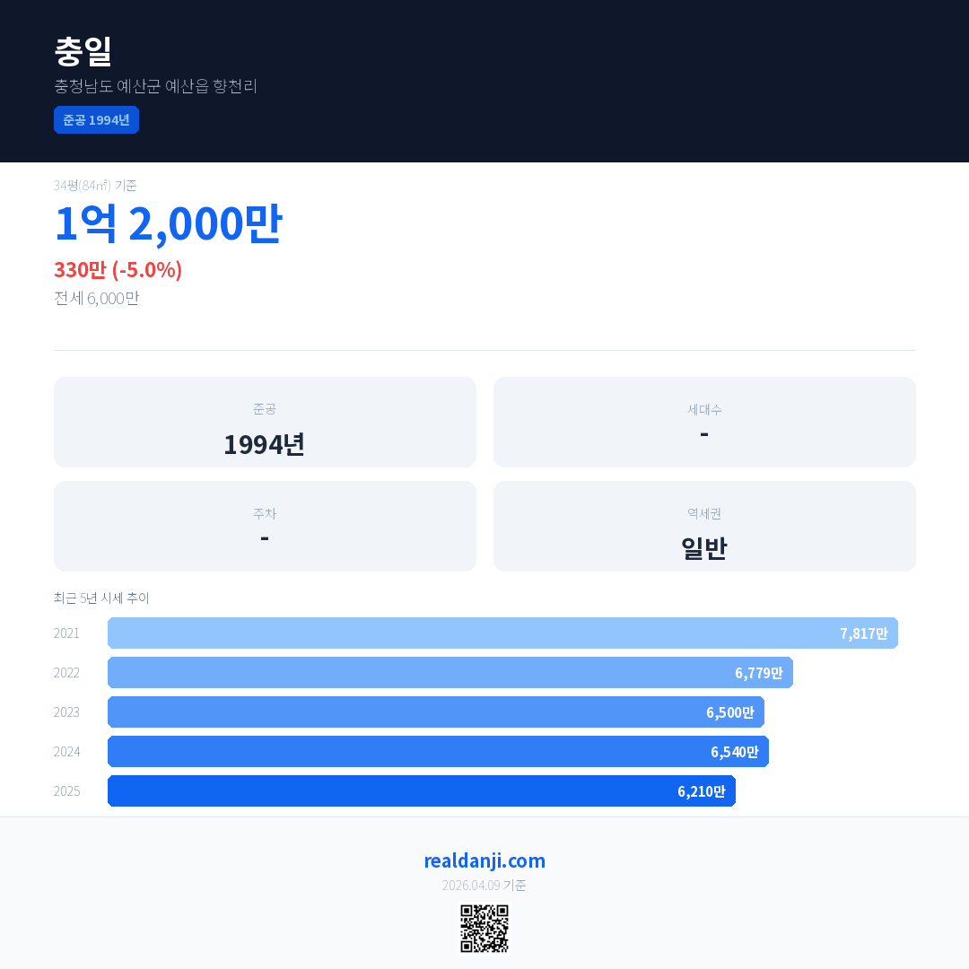 충일 국민평형 기준 2025년 평균 거래가는 6,210만으로, 전년 대비 5.0% 하락 했습니다.