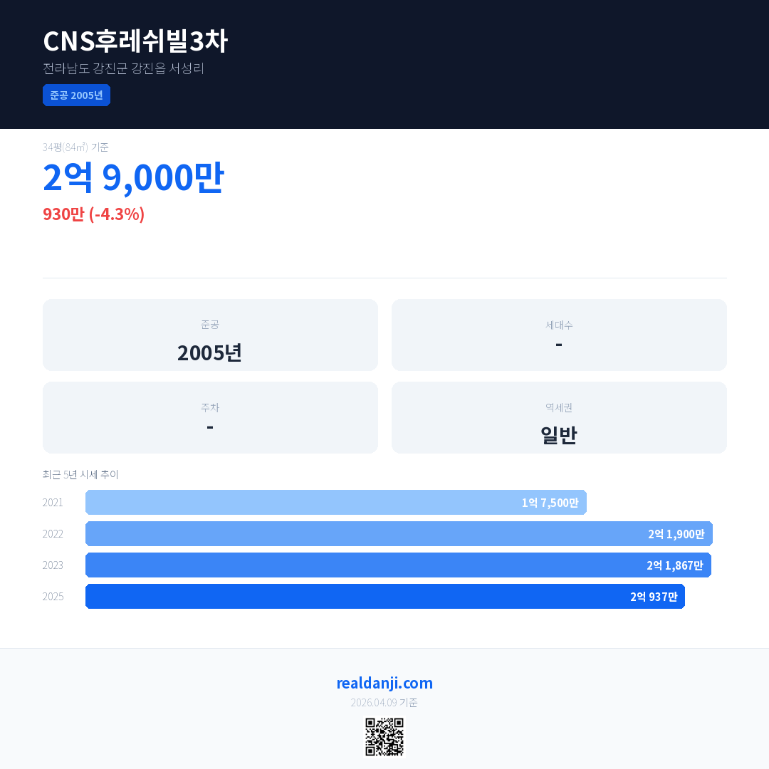 CNS후레쉬빌3차 국민평형 기준 2025년 평균 거래가는 2억 937만으로, 전년 대비 4.3% 하락 했습니다.