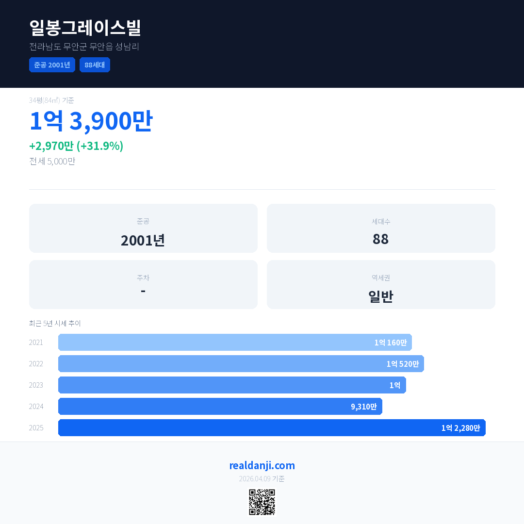 일봉그레이스빌 국민평형 기준 2025년 평균 거래가는 1억 2,280만으로, 전년 대비 31.9% 상승 했습니다.