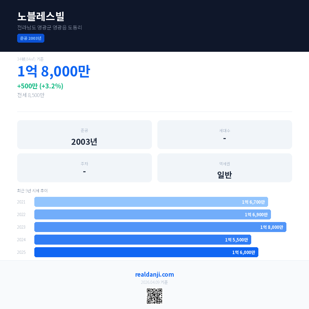 노블레스빌 국민평형 기준 2025년 평균 거래가는 1억 6,000만으로, 전년 대비 3.2% 상승 했습니다.