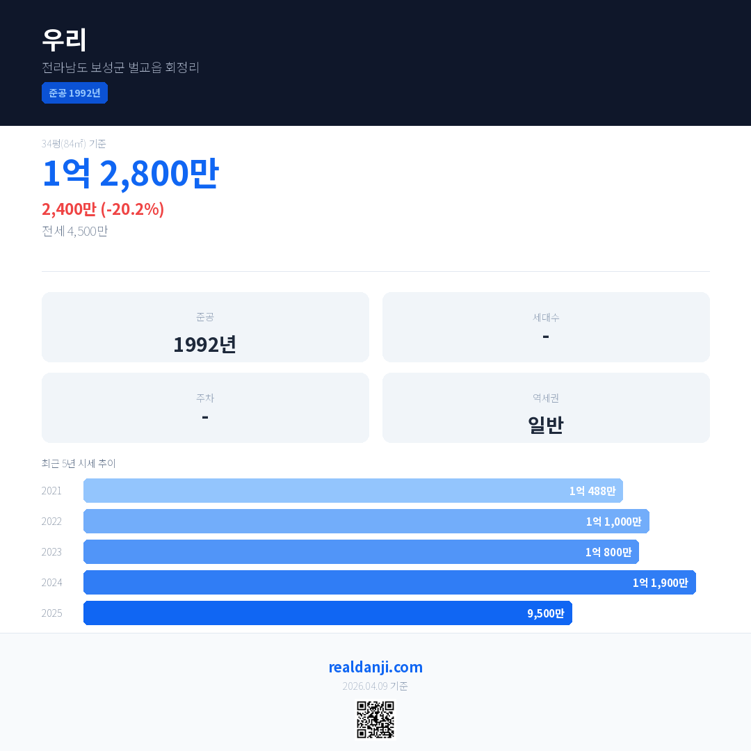 우리 국민평형 기준 2025년 평균 거래가는 9,500만으로, 전년 대비 20.2% 하락 했습니다.