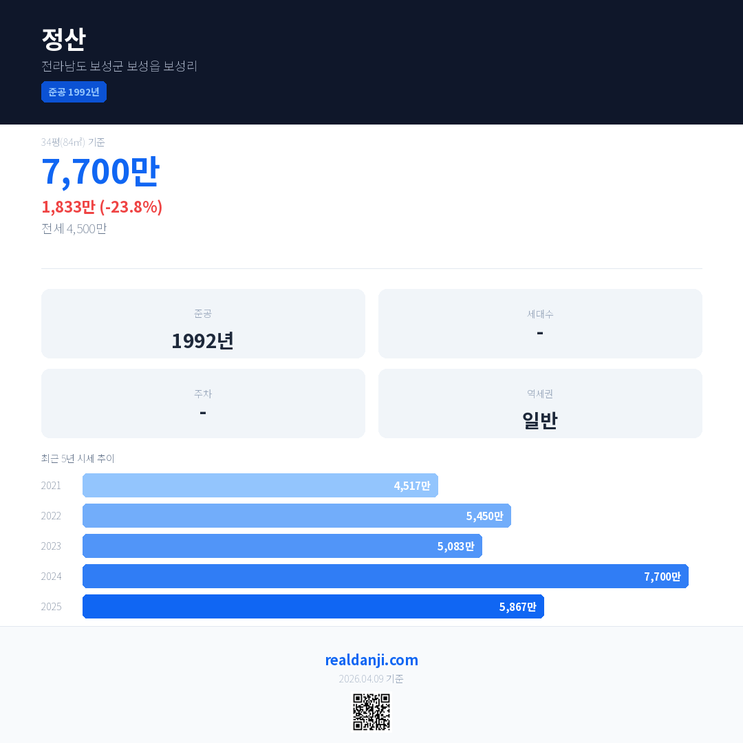 정산 최근 거래가는 7,700만입니다. (2025-12)
