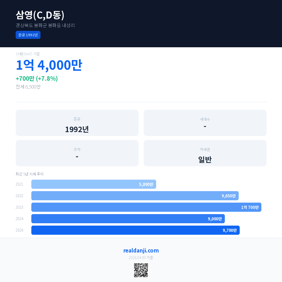 삼영(C,D동) 국민평형 기준 2026년 평균 거래가는 9,700만으로, 전년 대비 7.8% 상승 했습니다.