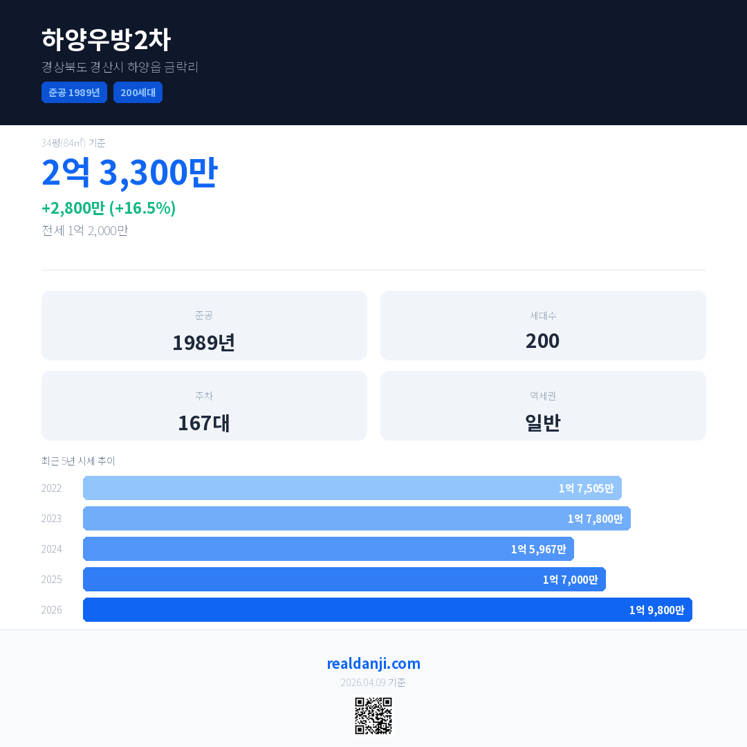 하양우방2차 국민평형 기준 2026년 평균 거래가는 1억 9,800만으로, 전년 대비 16.5% 상승 했습니다.
