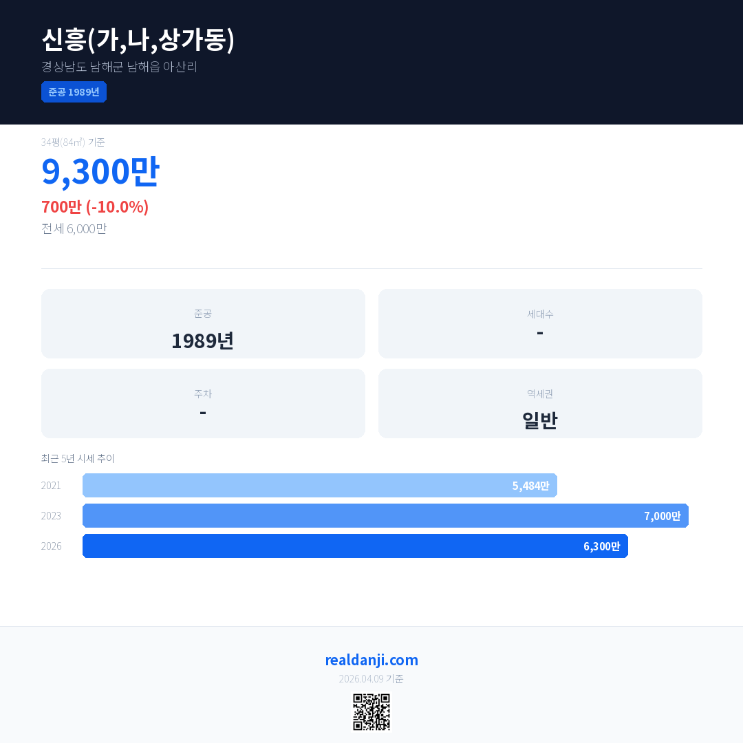 신흥(가,나,상가동) 국민평형 기준 2026년 평균 거래가는 6,300만으로, 전년 대비 10.0% 하락 했습니다.
