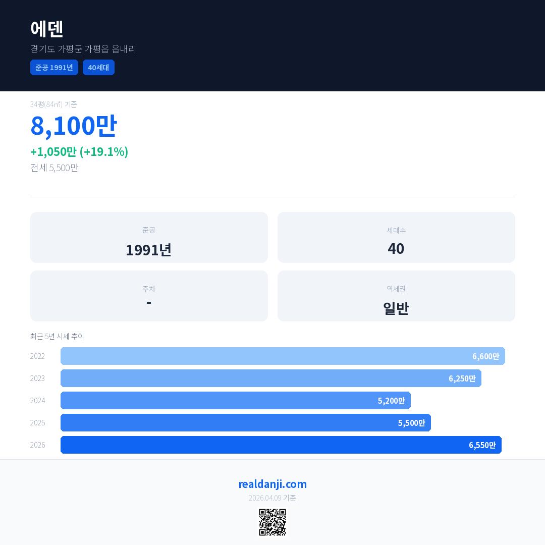 에덴 국민평형 기준 2026년 평균 거래가는 6,550만으로, 전년 대비 19.1% 상승 했습니다.