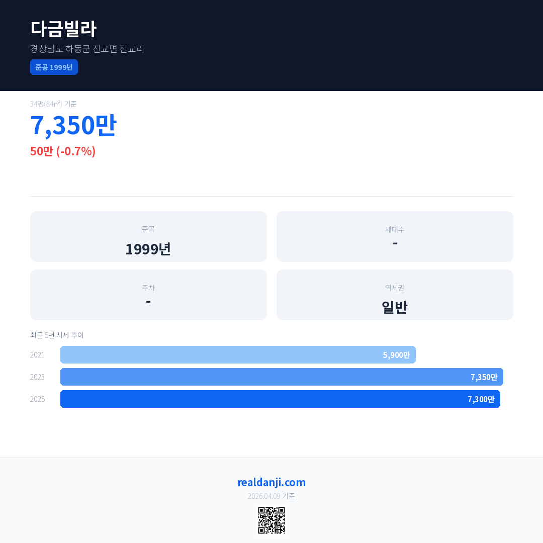 다금빌라 국민평형 기준 2025년 평균 거래가는 7,300만으로, 전년 대비 0.7% 하락 했습니다.