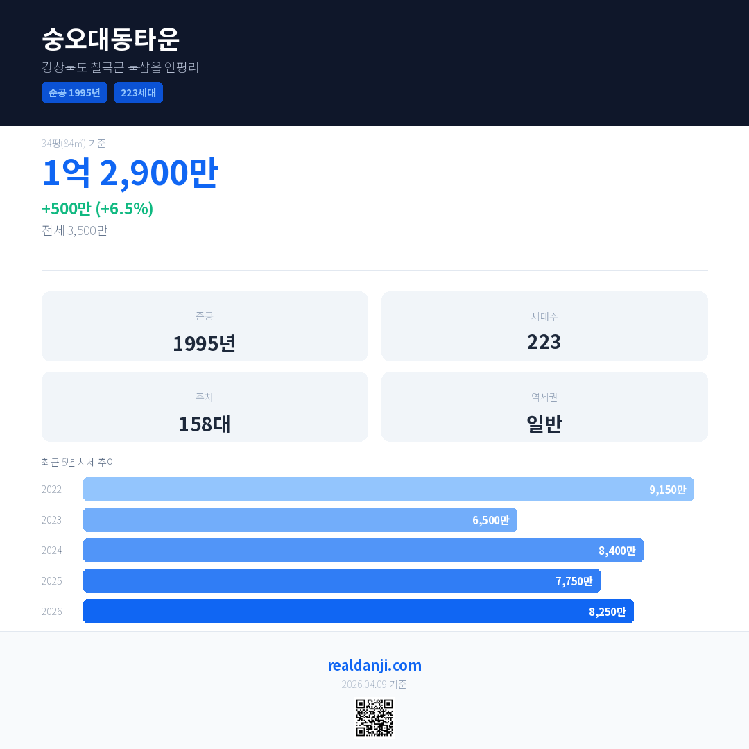 숭오대동타운 국민평형 기준 2026년 평균 거래가는 8,250만으로, 전년 대비 6.5% 상승 했습니다.