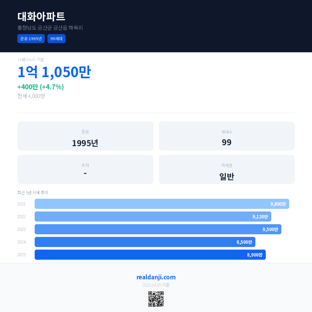 대화아파트 국민평형 기준 2025년 평균 거래가는 8,900만으로, 전년 대비 4.7% 상승 했습니다.