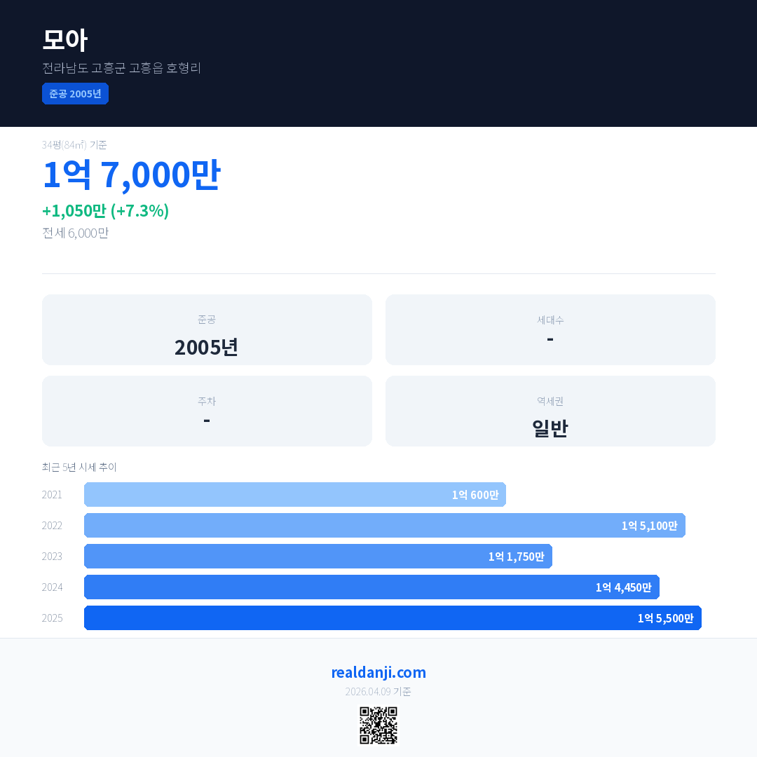 모아 국민평형 기준 2025년 평균 거래가는 1억 5,500만으로, 전년 대비 7.3% 상승 했습니다.