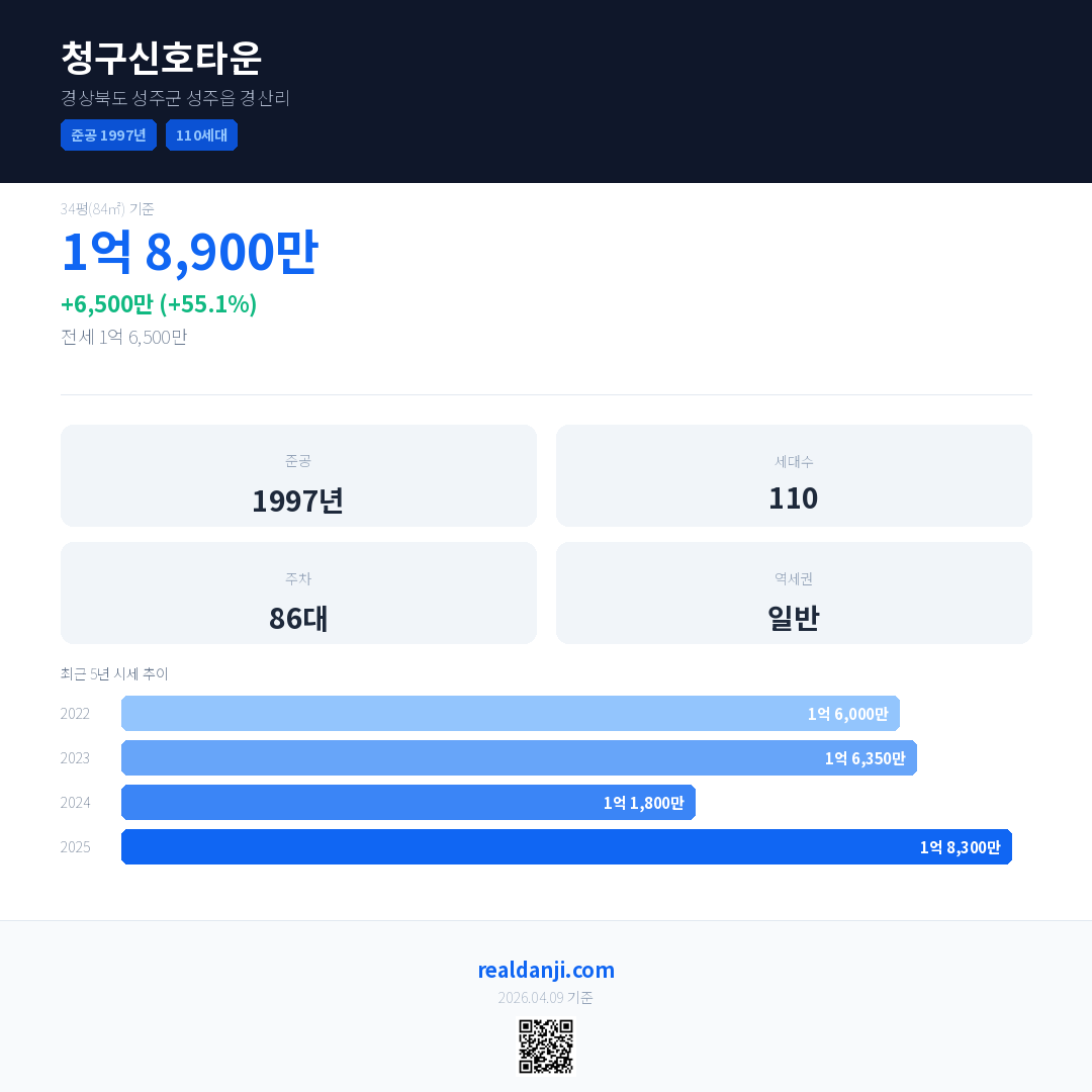 청구신호타운 국민평형 기준 2025년 평균 거래가는 1억 8,300만으로, 전년 대비 55.1% 상승 했습니다.