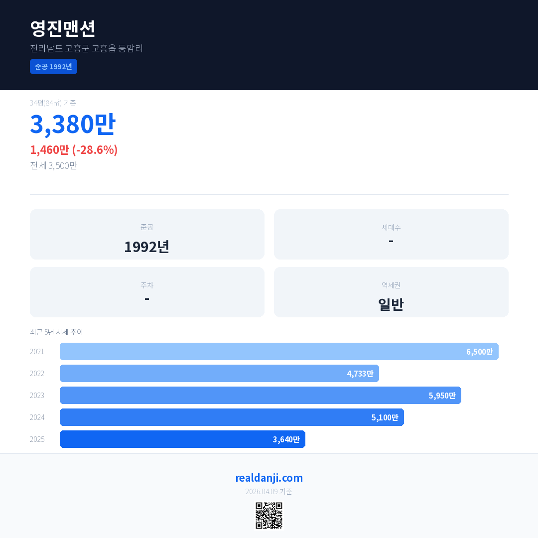 영진맨션 국민평형 기준 2025년 평균 거래가는 3,640만으로, 전년 대비 28.6% 하락 했습니다.