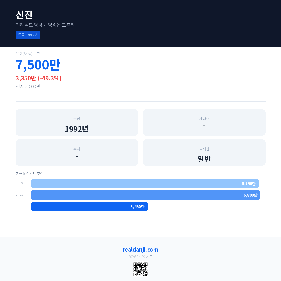 신진 국민평형 기준 2026년 평균 거래가는 3,450만으로, 전년 대비 49.3% 하락 했습니다.