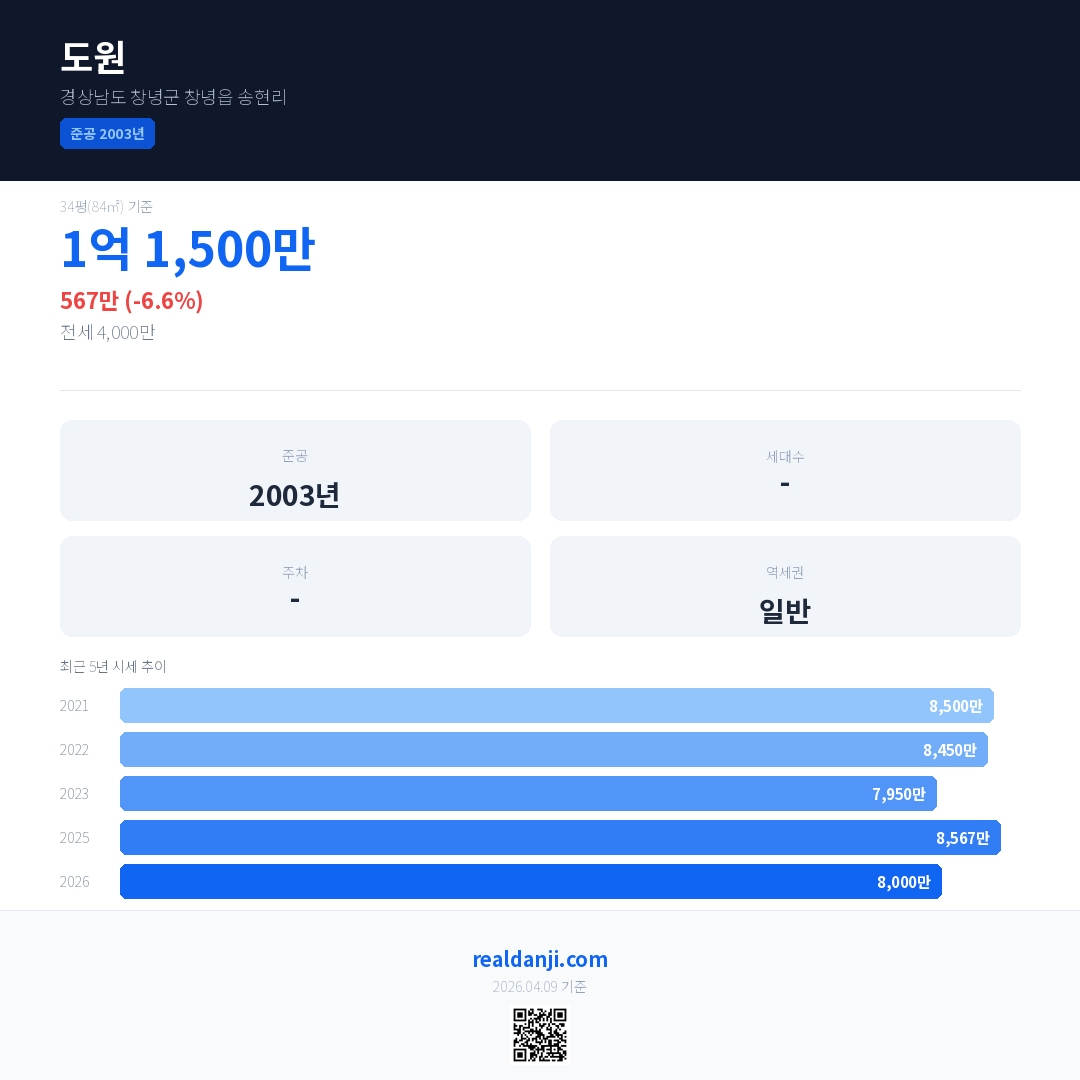 도원 국민평형 기준 2026년 평균 거래가는 8,000만으로, 전년 대비 6.6% 하락 했습니다.