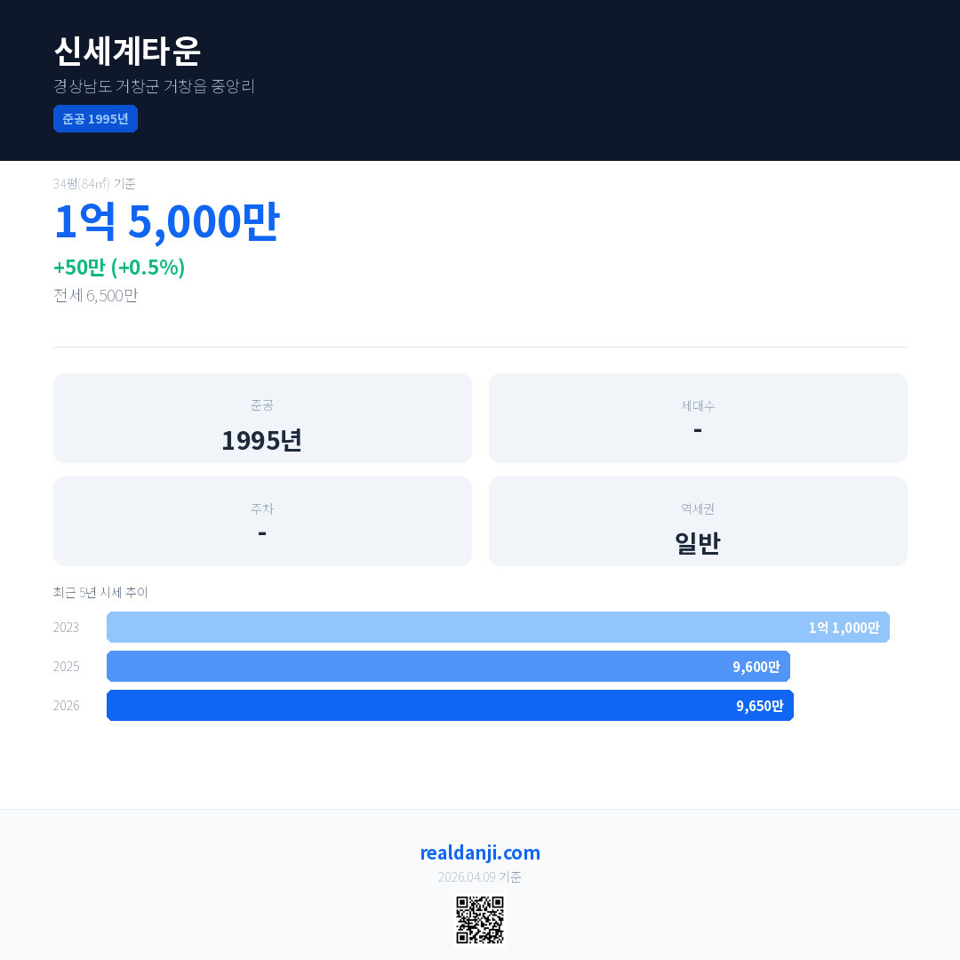 신세계타운 국민평형 기준 2026년 평균 거래가는 9,650만으로, 전년 대비 0.5% 상승 했습니다.
