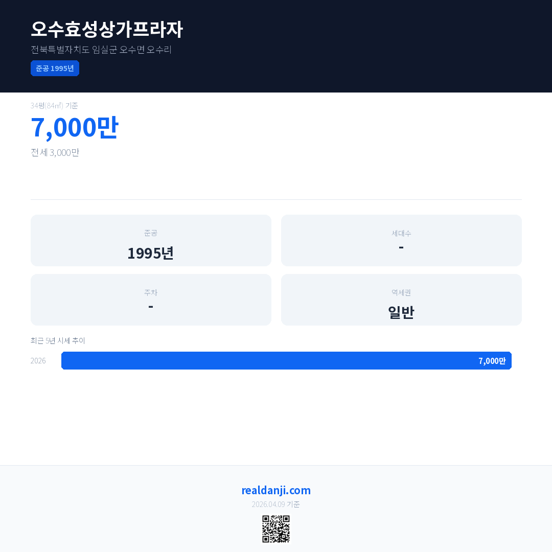 오수효성상가프라자 국민평형 기준 2026년 평균 거래가는 7,000만으로, 전년 대비 11.1% 상승 했습니다.