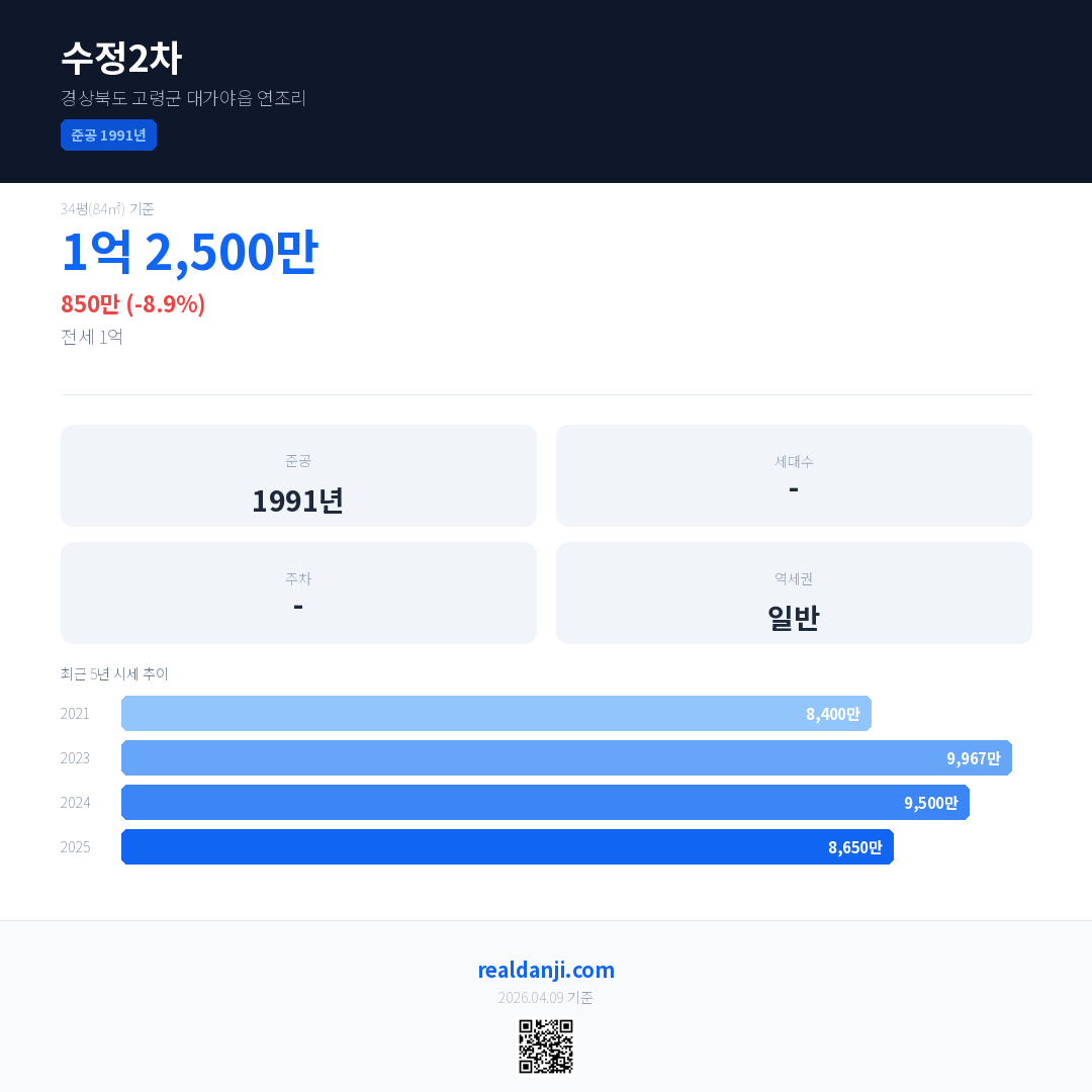 수정2차 국민평형 기준 2025년 평균 거래가는 8,650만으로, 전년 대비 8.9% 하락 했습니다.