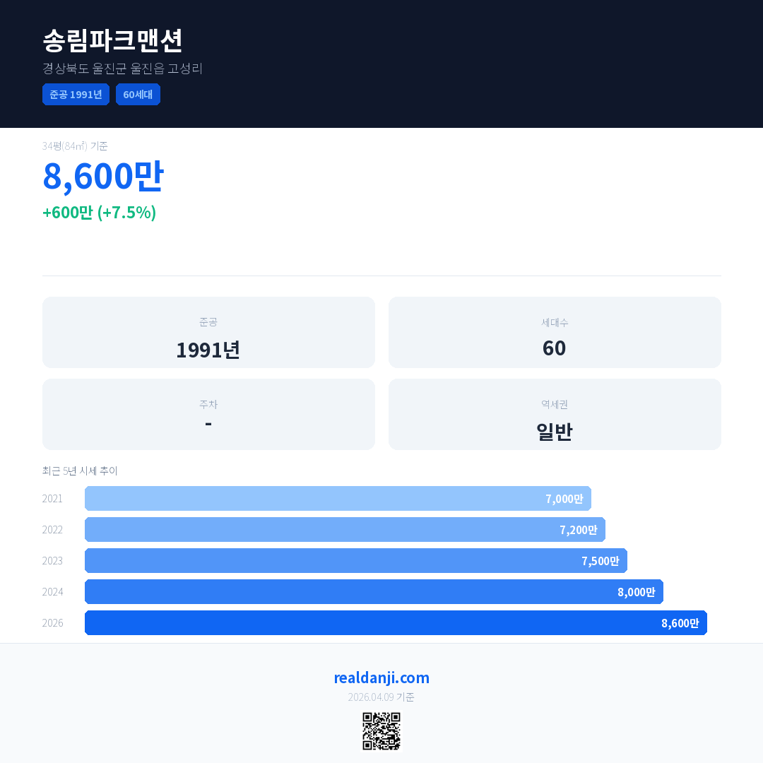 송림파크맨션 국민평형 기준 2026년 평균 거래가는 8,600만으로, 전년 대비 7.5% 상승 했습니다.