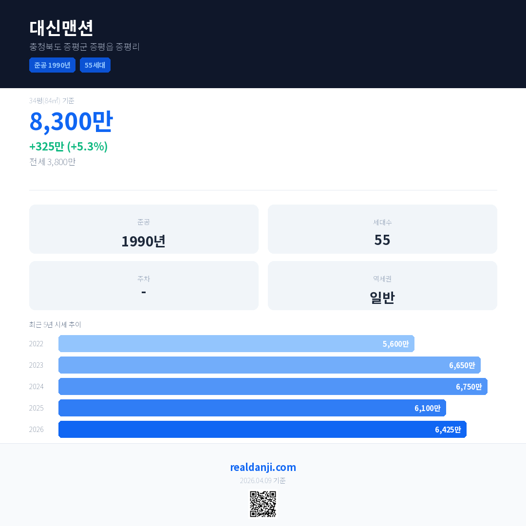 대신맨션 국민평형 기준 2026년 평균 거래가는 6,425만으로, 전년 대비 5.3% 상승 했습니다.