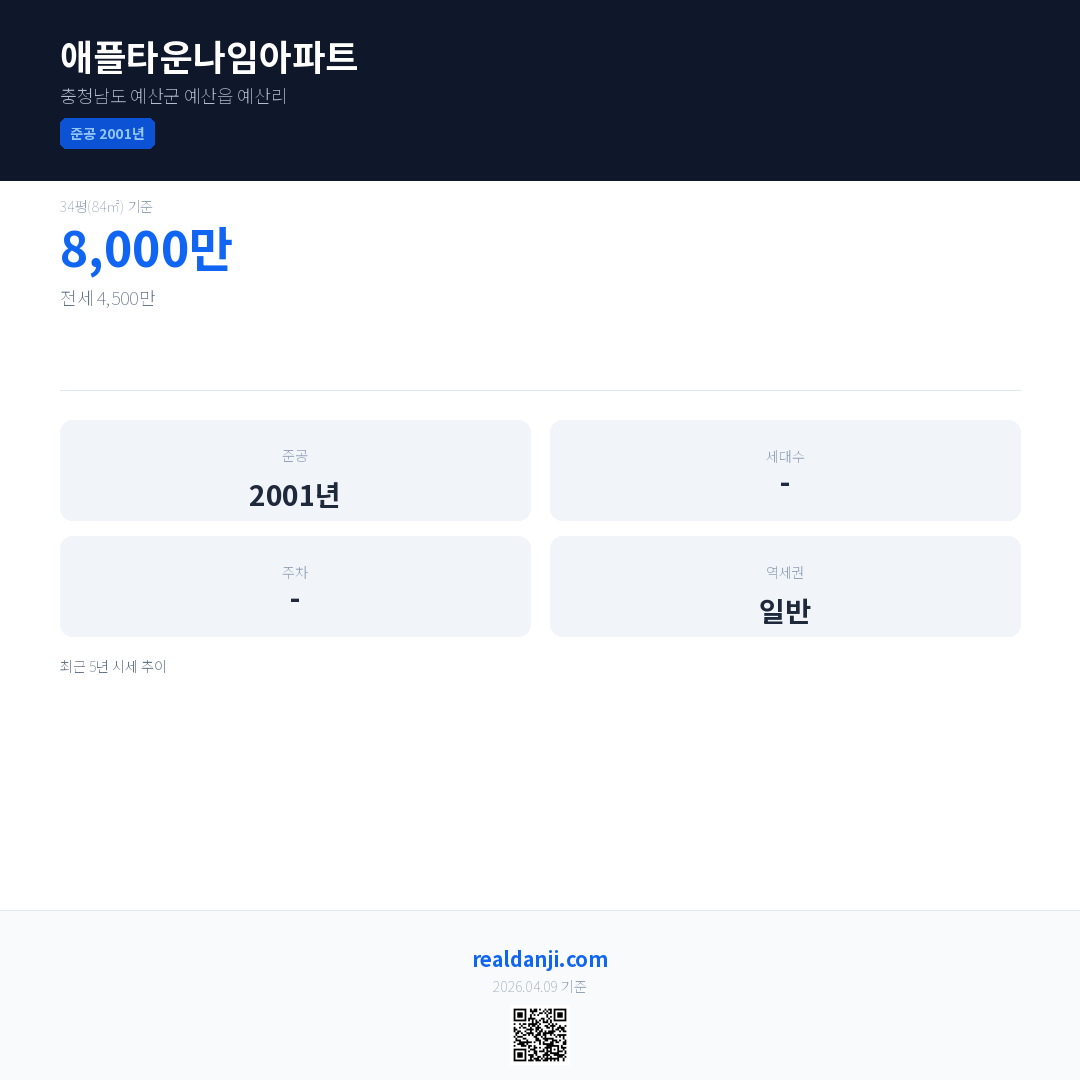 애플타운나임아파트은(는) 2001년에 준공되었으며, 현재 25년차입니다.