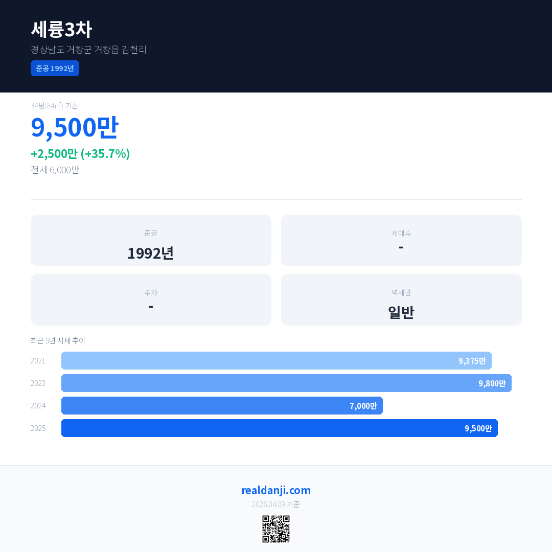 세륭3차 국민평형 기준 2025년 평균 거래가는 9,500만으로, 전년 대비 35.7% 상승 했습니다.