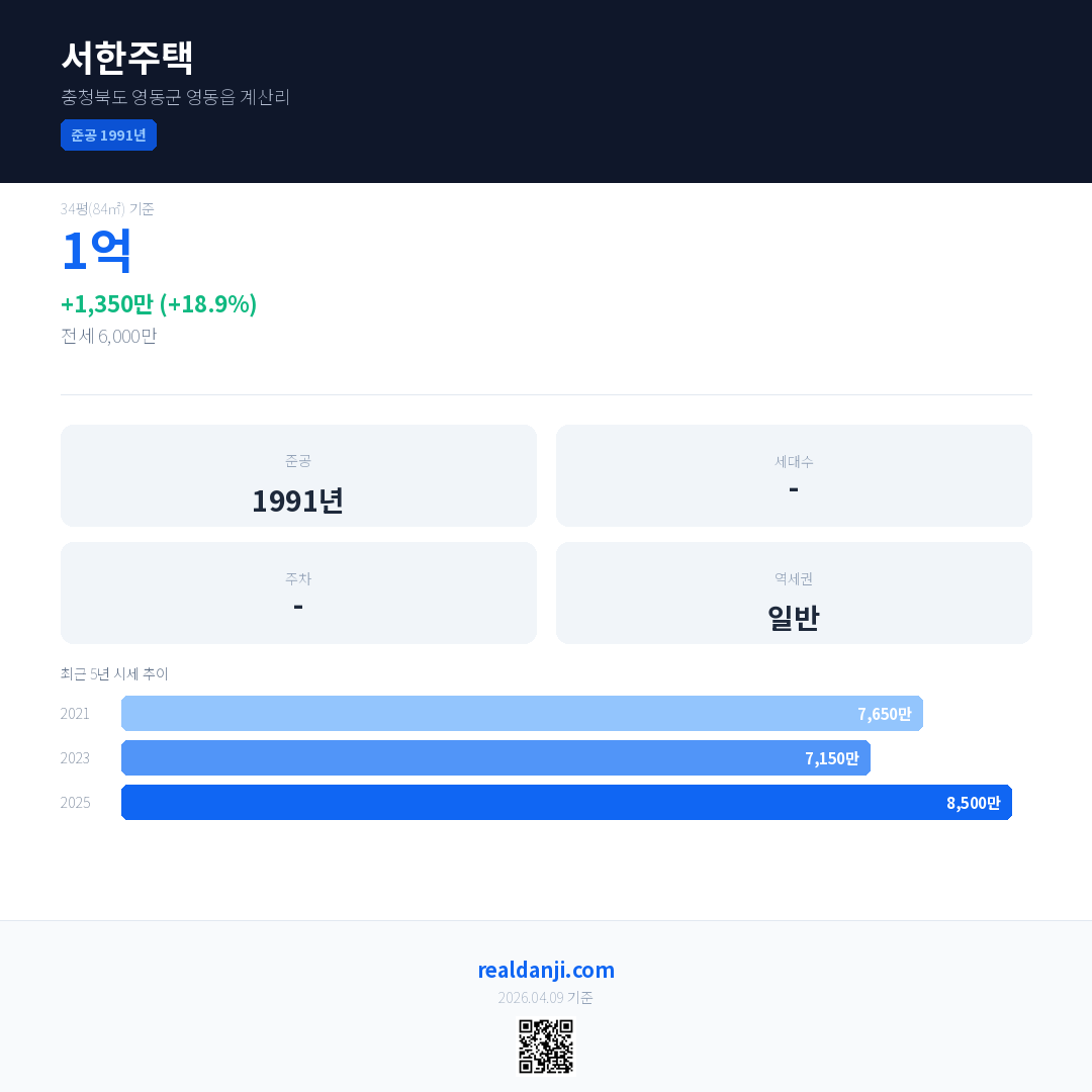 서한주택 국민평형 기준 2025년 평균 거래가는 8,500만으로, 전년 대비 18.9% 상승 했습니다.