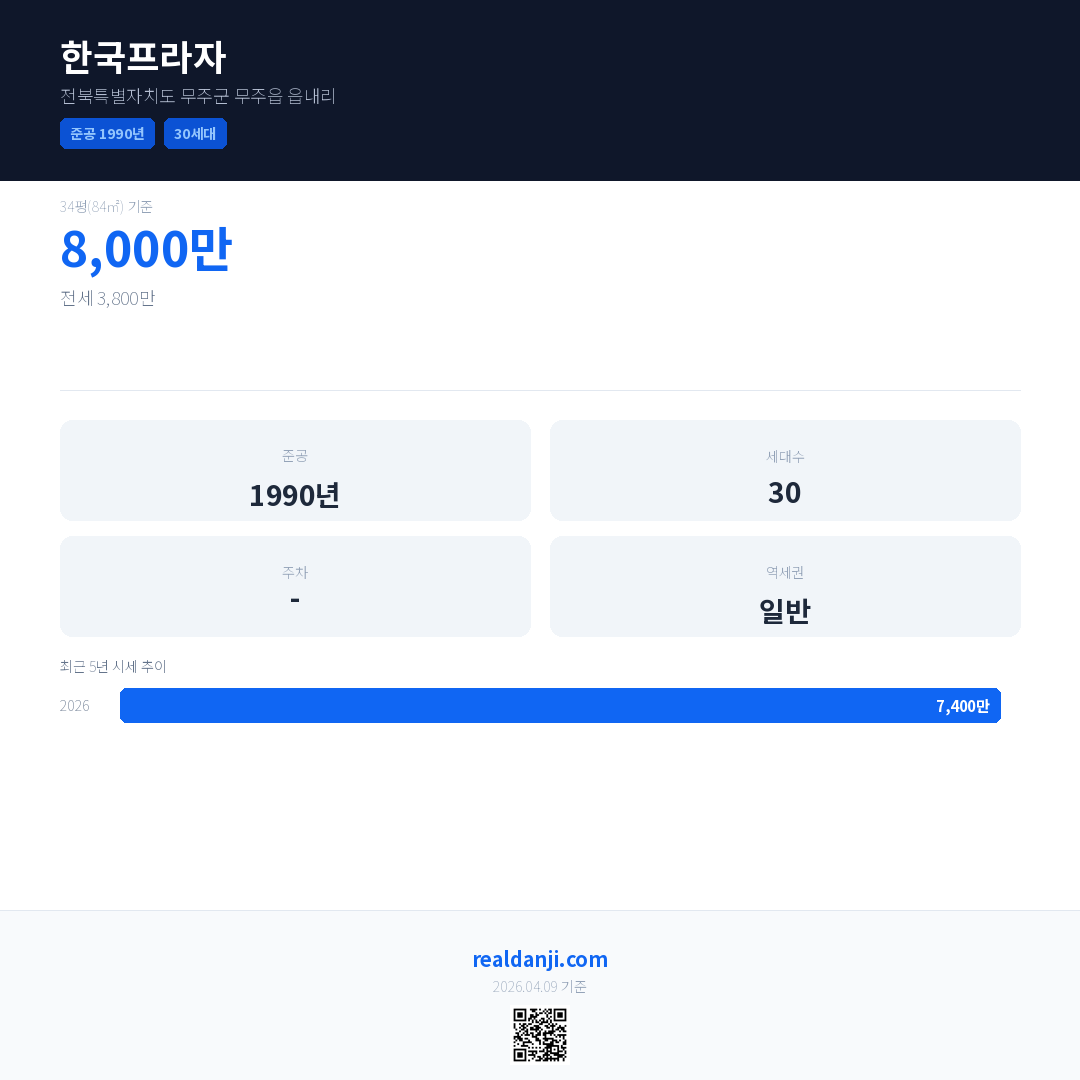 한국프라자 국민평형 기준 2026년 평균 거래가는 7,400만으로, 전년 대비 20.7% 상승 했습니다.