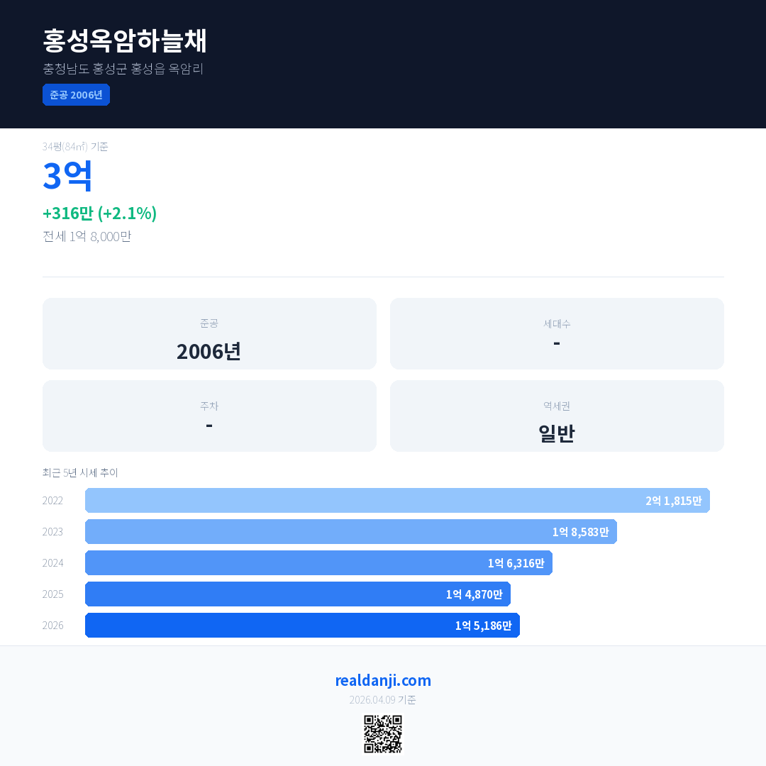 홍성옥암하늘채 국민평형 기준 2026년 평균 거래가는 1억 5,186만으로, 전년 대비 2.1% 상승 했습니다.