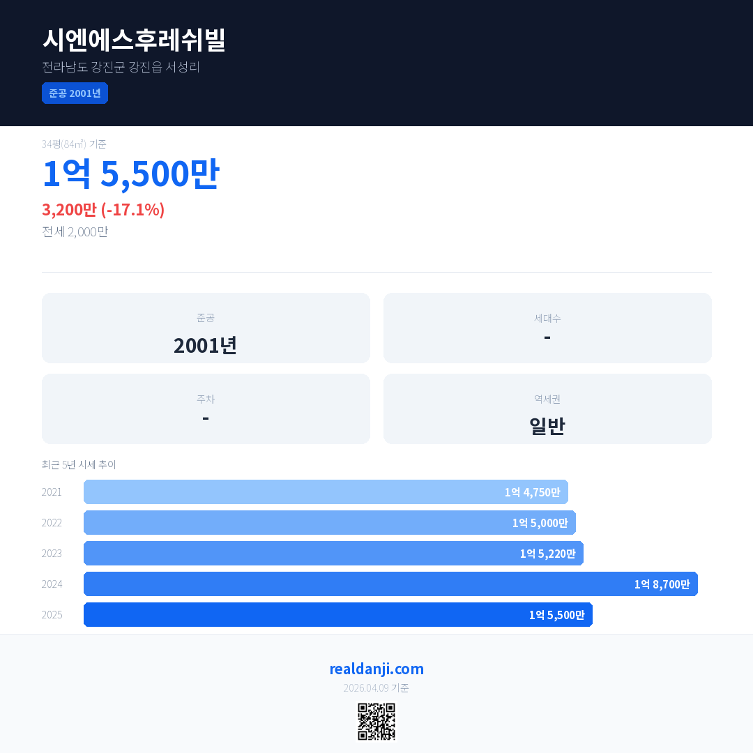 시엔에스후레쉬빌 국민평형 기준 2025년 평균 거래가는 1억 5,500만으로, 전년 대비 17.1% 하락 했습니다.