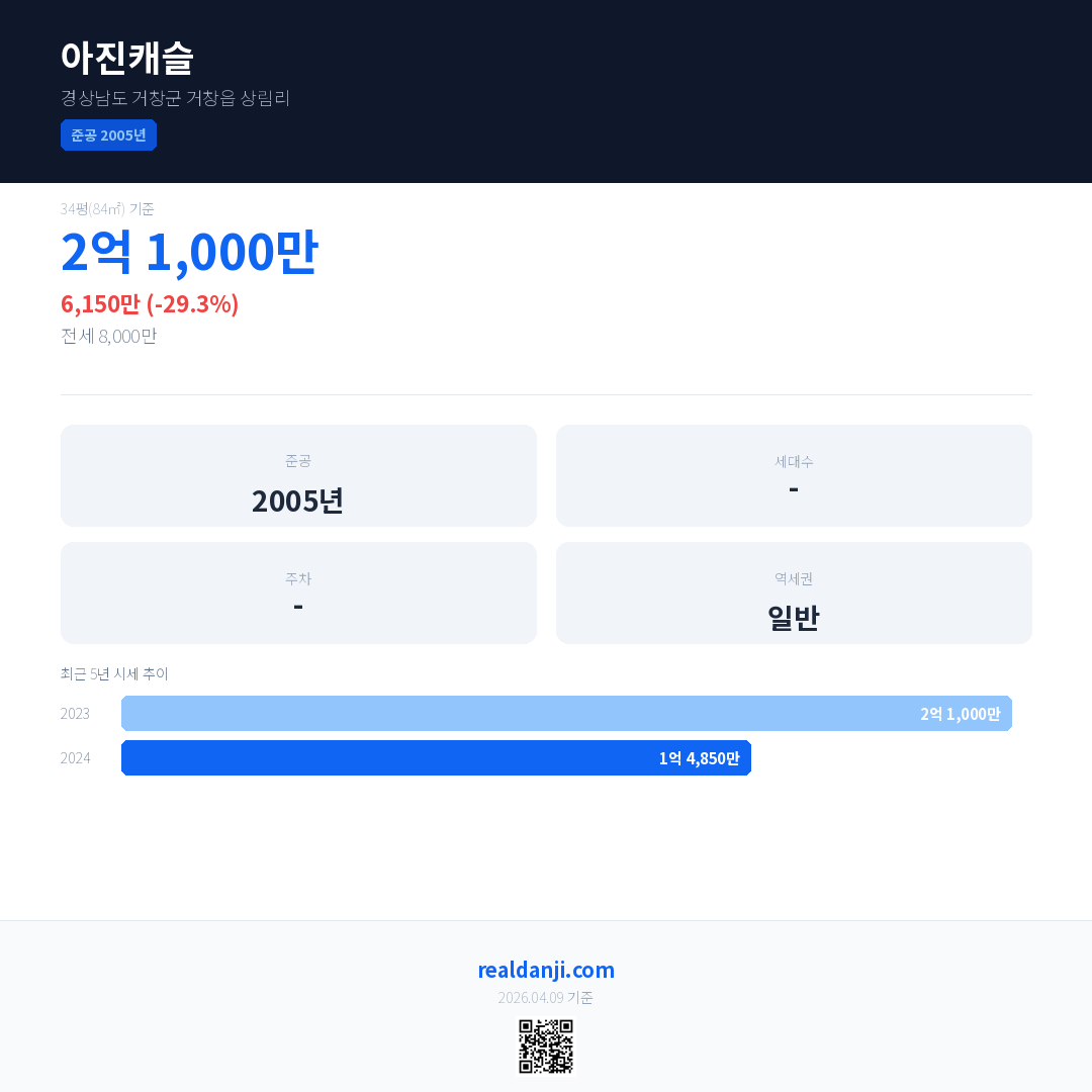 아진캐슬 국민평형 기준 2024년 평균 거래가는 1억 4,850만으로, 전년 대비 29.3% 하락 했습니다.