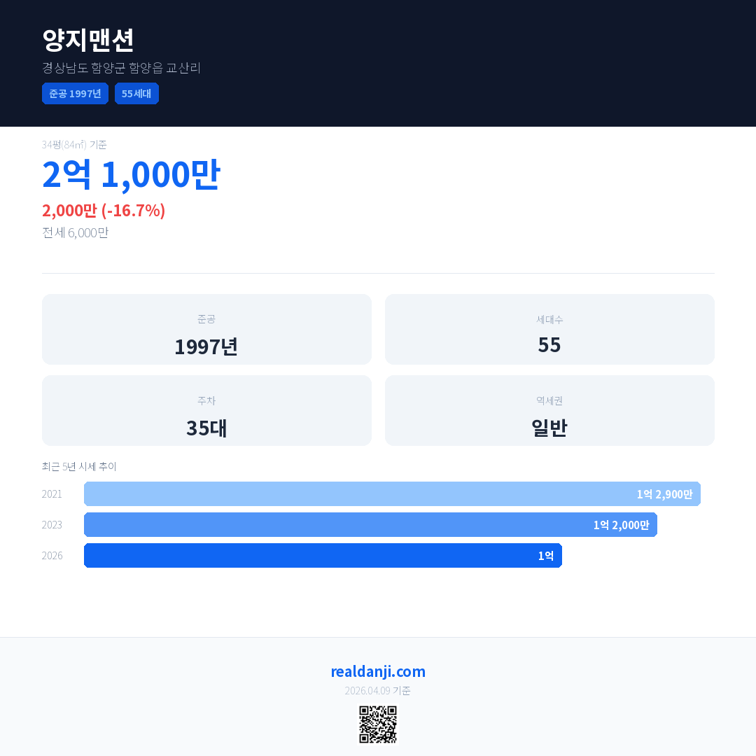 양지맨션 최근 거래가는 2억 1,000만입니다. (2026-03)