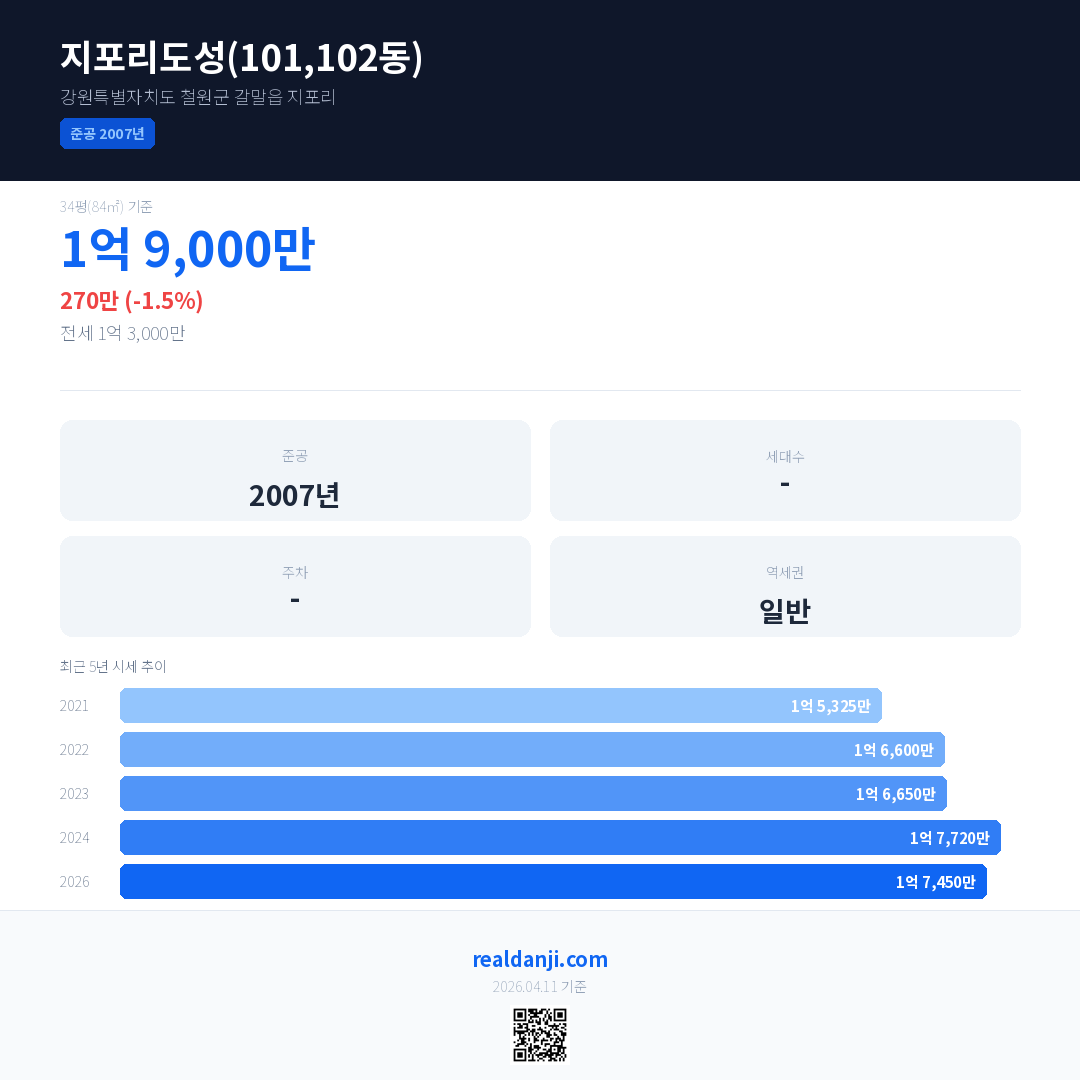 지포리도성(101,102동) 최근 거래가는 1억 9,000만입니다. (2026-03)