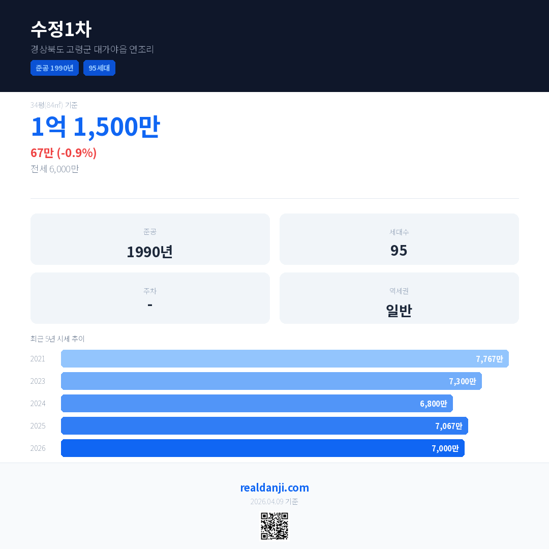 수정1차 국민평형 기준 2026년 평균 거래가는 7,000만으로, 전년 대비 0.9% 하락 했습니다.