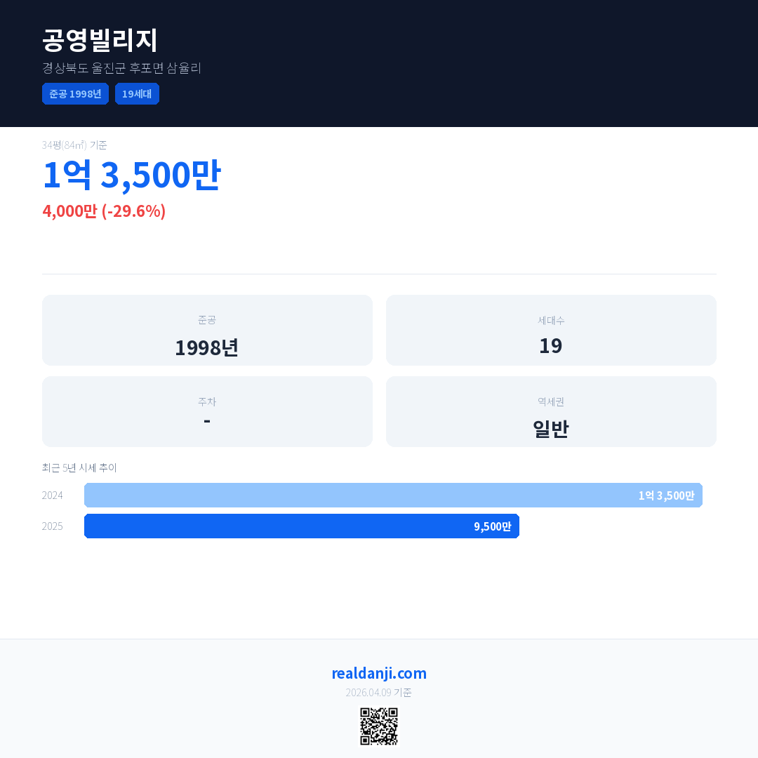 공영빌리지 국민평형 기준 2025년 평균 거래가는 9,500만으로, 전년 대비 29.6% 하락 했습니다.