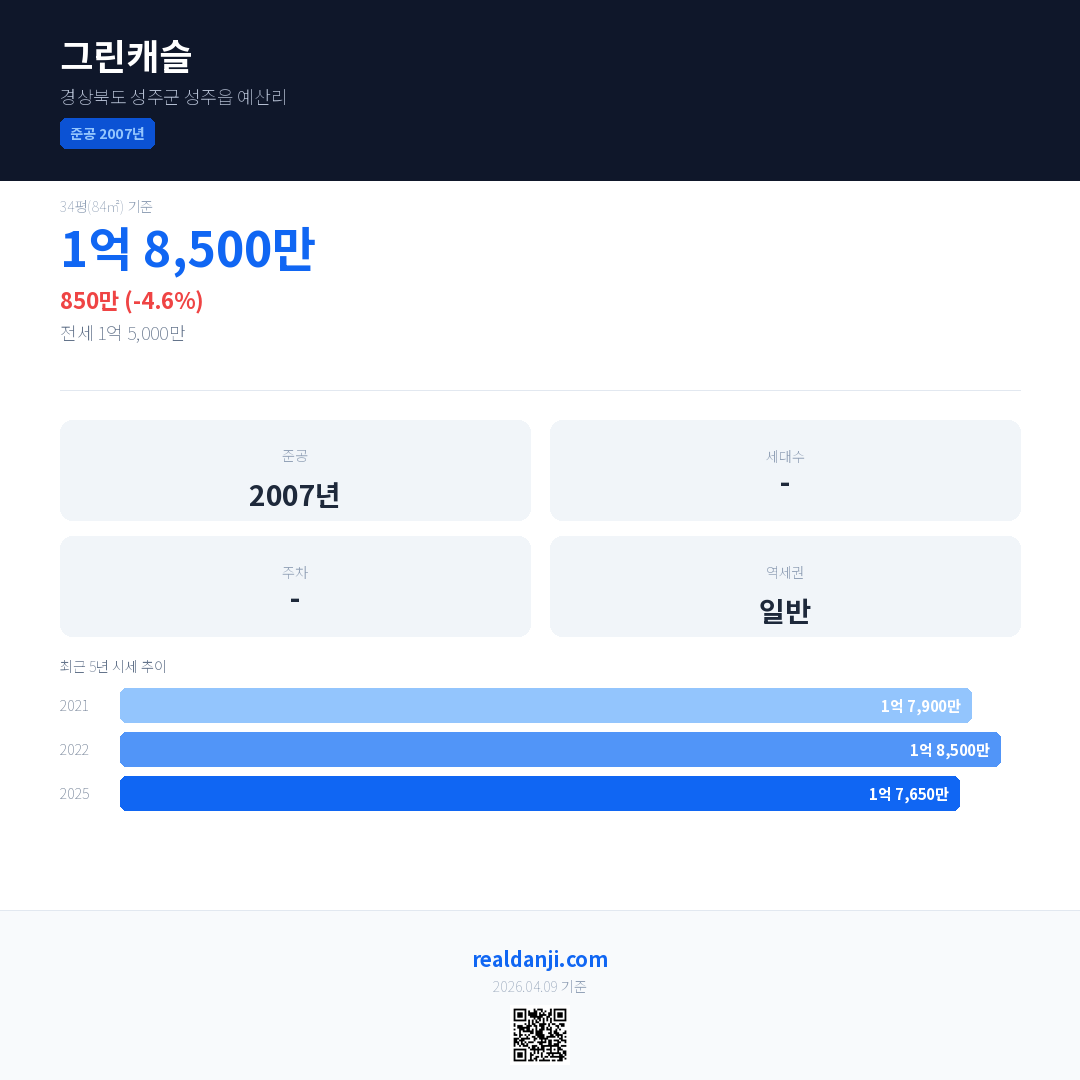 그린캐슬 국민평형 기준 2025년 평균 거래가는 1억 7,650만으로, 전년 대비 4.6% 하락 했습니다.