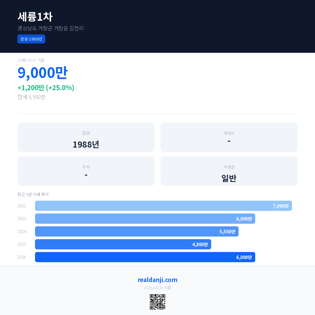 세륭1차 국민평형 기준 2026년 평균 거래가는 6,000만으로, 전년 대비 25.0% 상승 했습니다.