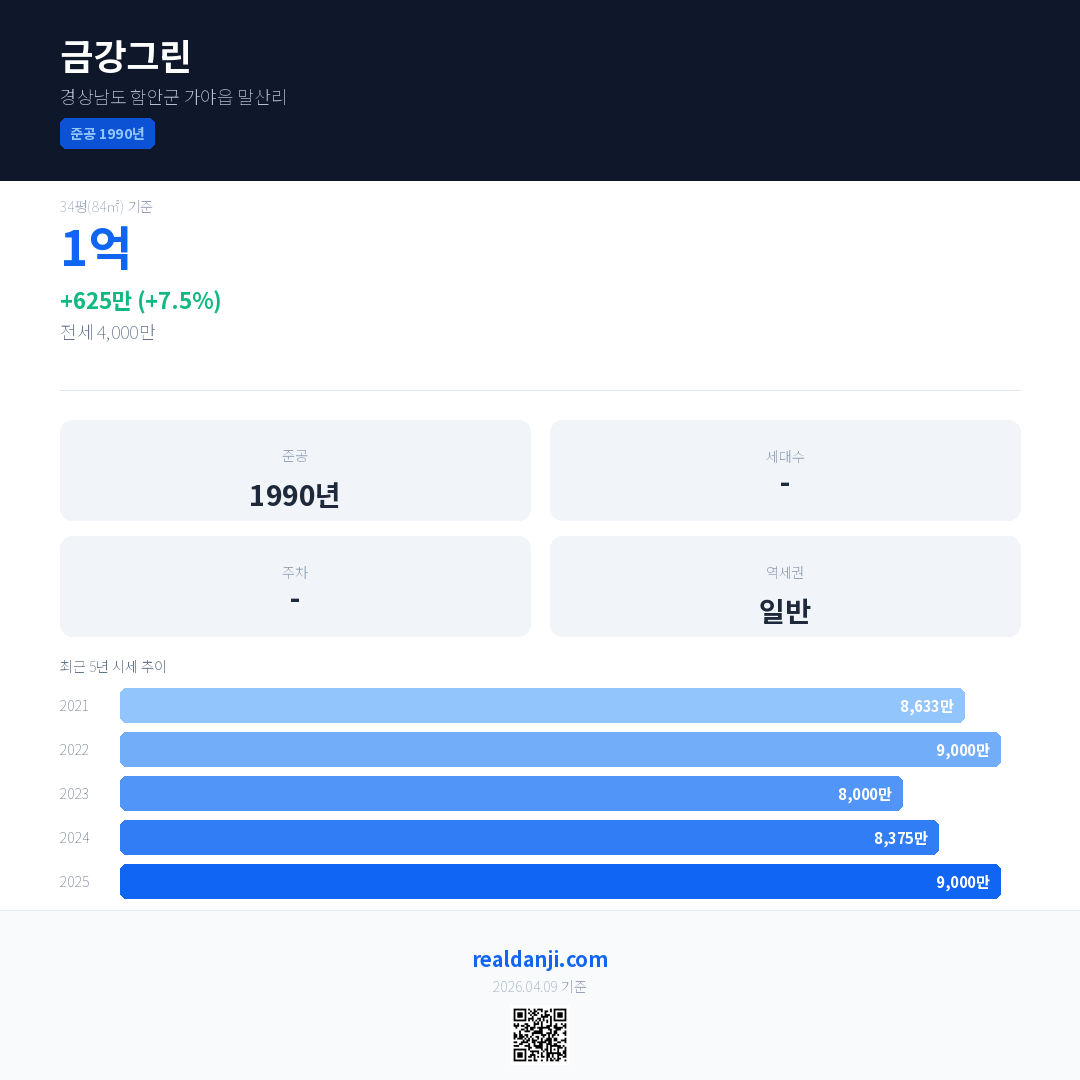 금강그린 최근 거래가는 1억입니다. (2025-08)