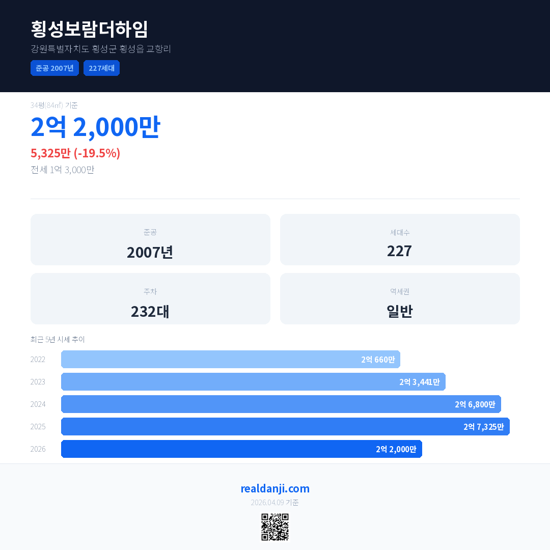 횡성보람더하임 국민평형 기준 2026년 평균 거래가는 2억 2,000만으로, 전년 대비 19.5% 하락 했습니다.