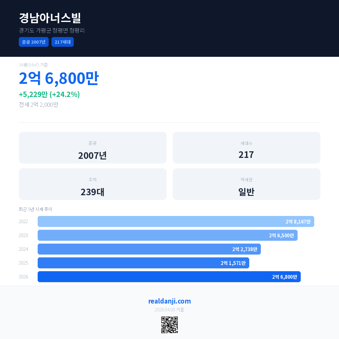 경남아너스빌 국민평형 기준 2026년 평균 거래가는 2억 6,800만으로, 전년 대비 24.2% 상승 했습니다.