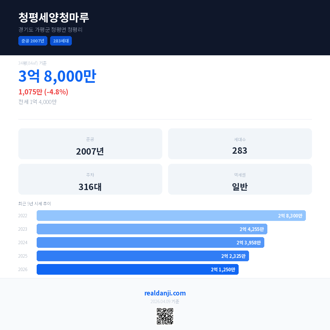 청평세양청마루 최근 거래가는 2억 2,000만입니다. (2026-04)